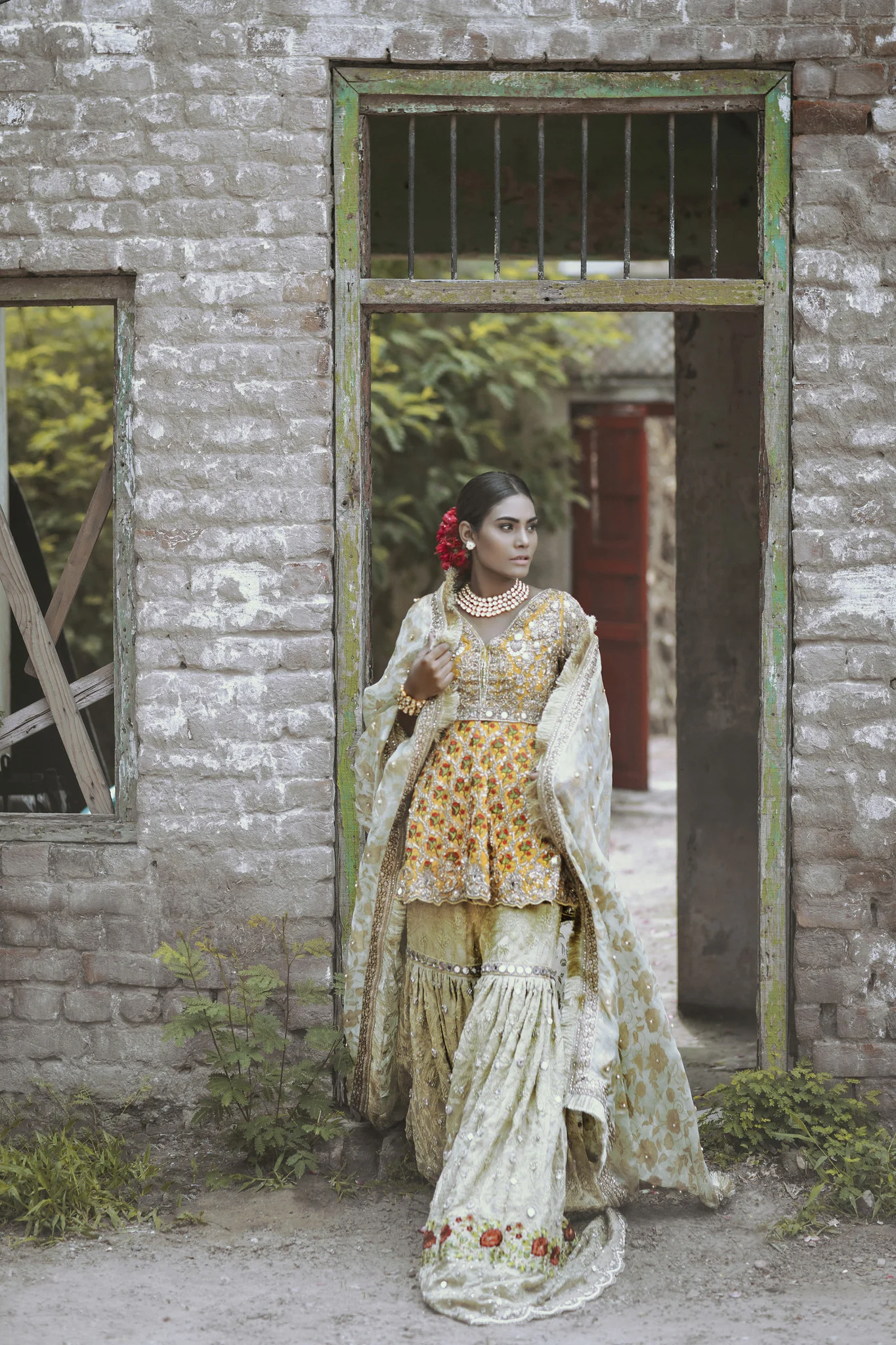 - RAW SILK YELLOW TOP, MINT ORGANZA GHARARA WITH ORGANZA DUPATTA
